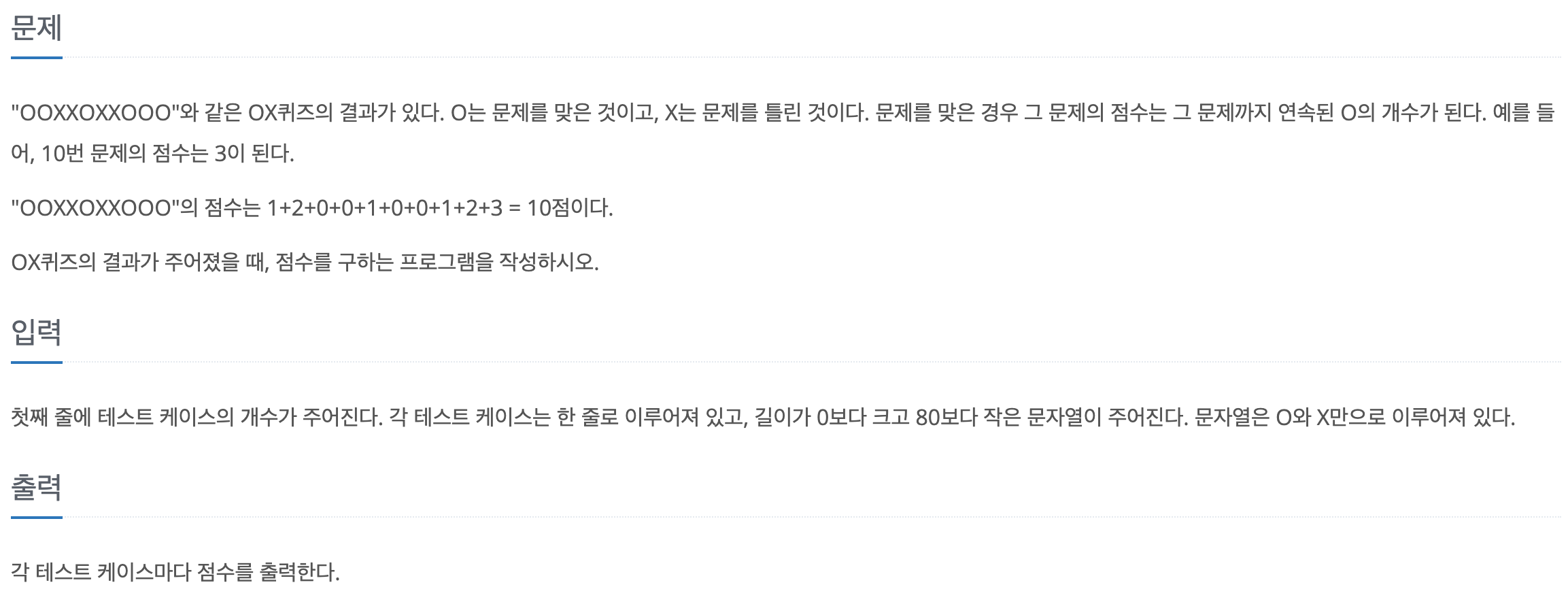 import java.util.Scanner; class Main { public static void main(String[] args) { Scanner s = new Scanner(System.in); int num = s.nextInt(); String[] list = new String[num]; for(int i = 0; i<num; i++){ list[i] = s.next(); } int[] result = new int[num]; for(int i = 0; i<num; i++){ int count = 0; for(int j = 0; j<list[i].length(); j++){ if(list[i].charAt(j) == 'O'){ count++; result[i] += count; } else if(list[i].charAt(j) == 'X'){ count = 0; } } } for(int i = 0; i<num; i++){ System.out.println(result[i]); } } }'2022_PPS > 2주차' 카테고리의 다른 글