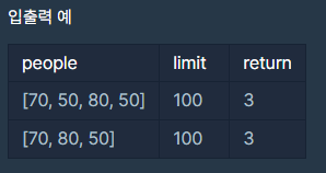 - 구명보트의 무게 제한은 항상 사람들의 몸무게 중 최댓값보다 크게 주어지므로 사람들을 구출할 수 없는 경우는 없습니다.