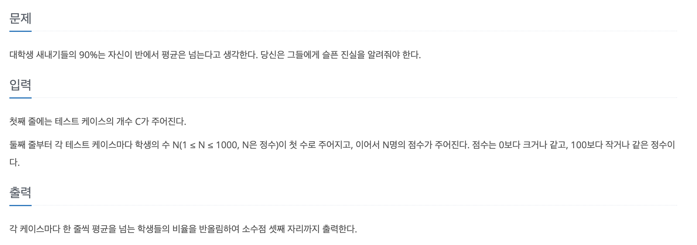 import java.util.*; class Main { public static void main(String[] args) { Scanner s = new Scanner(System.in); int length = s.nextInt(); int count = 0; int[] avg = new int[length]; ArrayList<Integer>[] all = new ArrayList[length]; for(int i = 0; i<length; i++){ int num = s.nextInt(); all[i] = new ArrayList<Integer>(); for(int j = 0; j<num; j++){ int jumsu = s.nextInt(); all[i].add(jumsu); count += jumsu; } avg[i] = count/num; count = 0; } int num_Count = 0; double[] over_avg = new double[length]; for(int i = 0; i<length; i++){ for(int j = 0; j<all[i].size(); j++){ if(avg[i] < all[i].get(j)) num_Count++; } over_avg[i] = num_Count*100.0/all[i].size(); num_Count = 0; } for(int i = 0; i<length; i++){ System.out.println(String.format("%.3f", over_avg[i]) + "%"); } } }'2022_PPS > 1주차' 카테고리의 다른 글