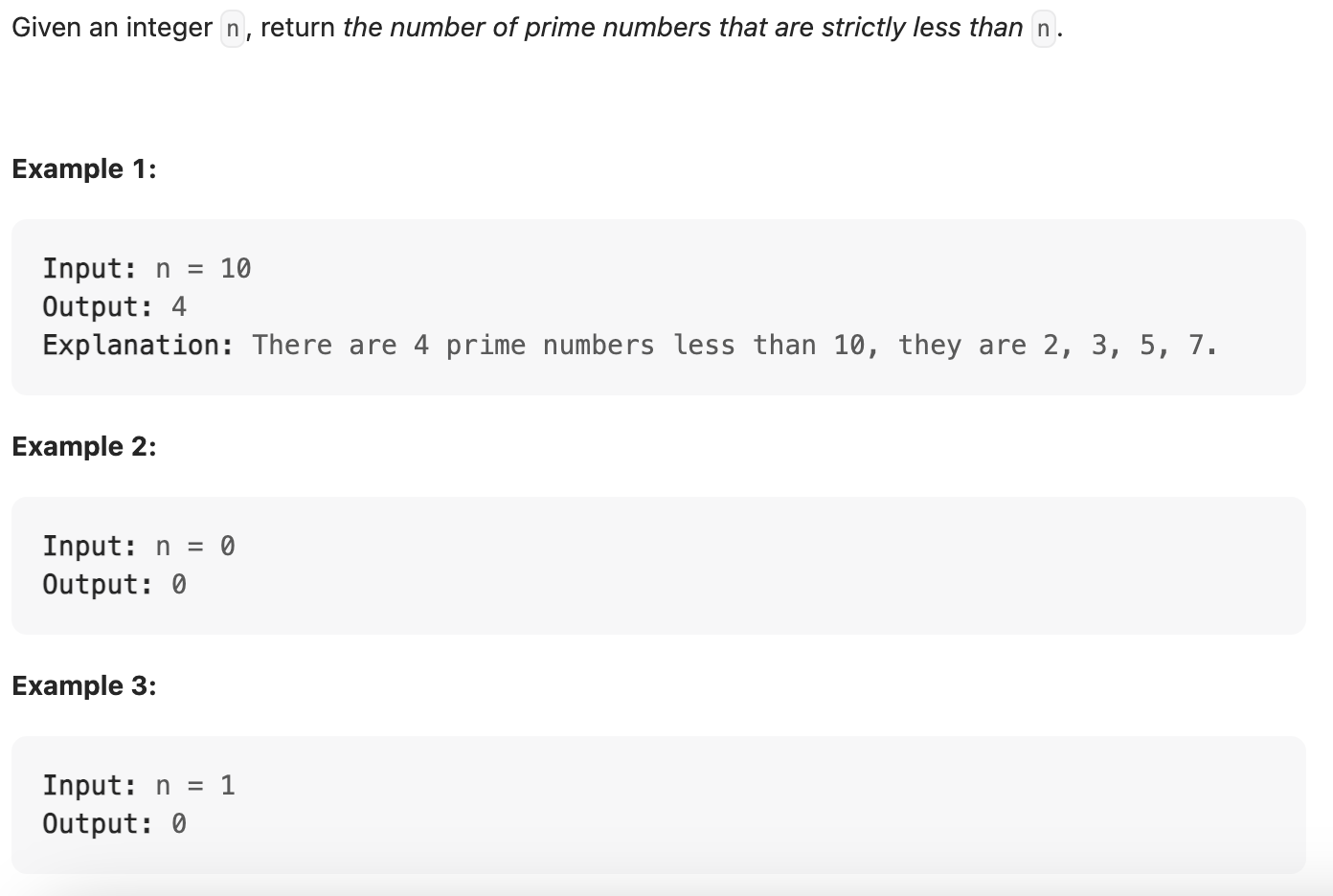 class Solution { public int countPrimes(int n) { int count = 0; int num[] = new int[n+1]; for(int i = 2; i<n; i++){ if(num[i] == 0){ count++; for(int j = i; j<n; j += i) num[j] = 1; } } return count; } }'2022_PPS > 3주차' 카테고리의 다른 글
