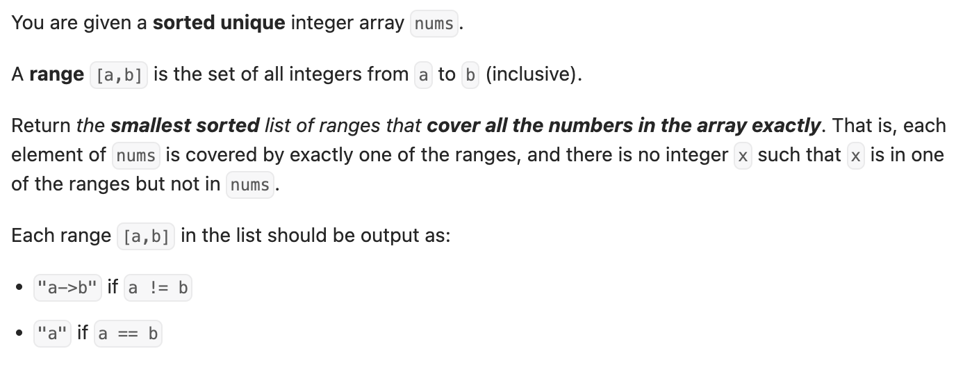class Solution { public List<String> summaryRanges(int[] nums) { List<String> list = new ArrayList<String>(); for(int i = 0; i<nums.length; i++){ int start = nums[i]; int end = nums[i]; int same = 0; for(int j = i; j<nums.length-1; j++){ if(nums[j+1] - nums[j] == 1) end++; else if(nums[j+1] - nums[j] == 0) same++; else break; } String s = ""; if(start == end) s = Integer.toString(start); else s = Integer.toString(start) + "->" + Integer.toString(end); list.add(s); i += (end - start + same); } return list; } }'2022_PPS > 3주차' 카테고리의 다른 글