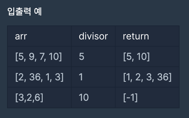 divisor로 나누어 떨어지는 element가 하나도 없다면 배열에 -1을 담아 반환하세요.제한사항