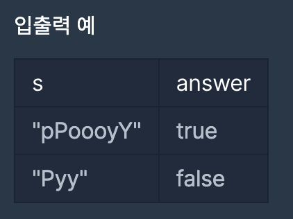 예를 들어 s가 "pPoooyY"면 true를 return하고 "Pyy"라면 false를 return합니다.